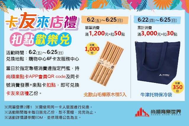 當日於指定專櫃單筆消費滿1,200元,持尚順樂點卡APP會員QRCODE及同卡號消費發票+樂點卡扣50點,即可兌換北歐山毛櫸原木筷5入乙份,恕不累贈,兌完為止。